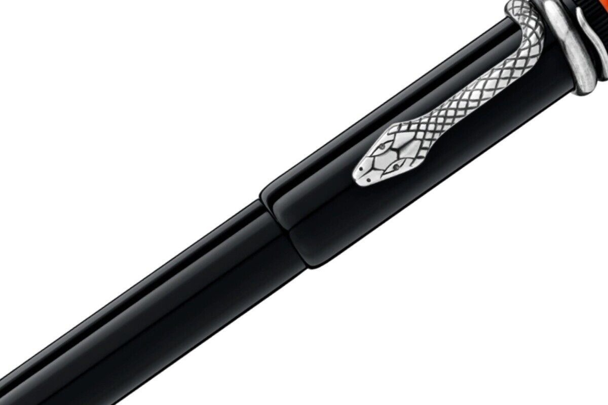 The cap top is the traditional off-white snow cap, embedded in coral red precious resin that recalls the vintage Rouge & Noir. The Special Edition Coral has a coral lacquer barrel and coral resin cap. Its serpent clip is set with green gemstone eyes. The piston fountain pen has a 14K gold and rhodium nib. Also includes a rollerball and ballpoint pen.