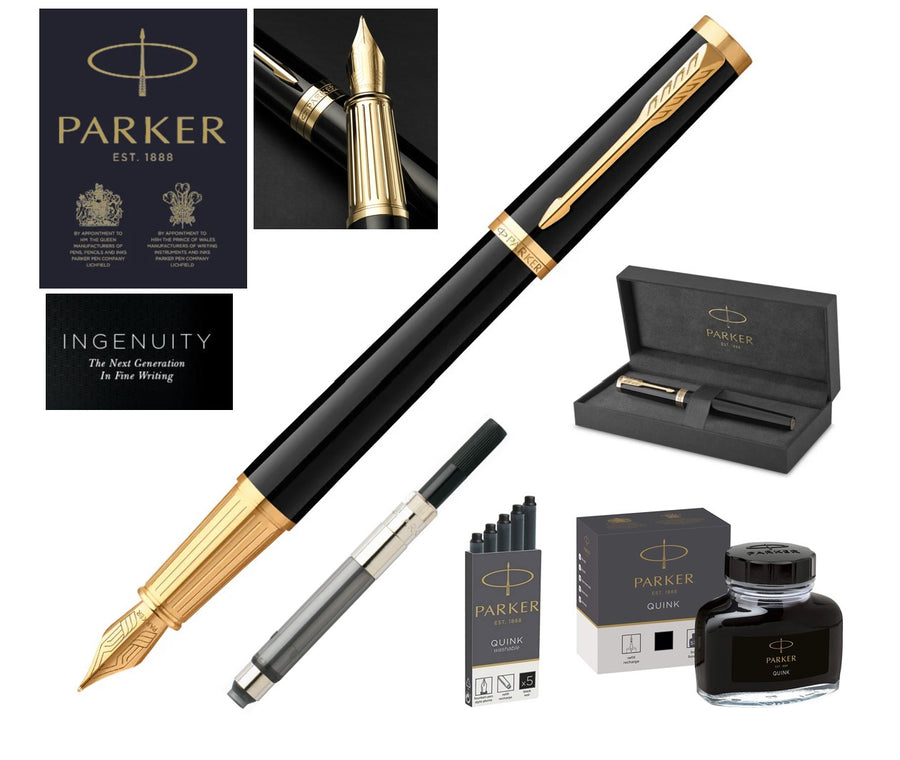 Parker Ingenuity Fountain Pen SET & Accessories - Black Gold Trim (Medium) with FREE LASER Engraving