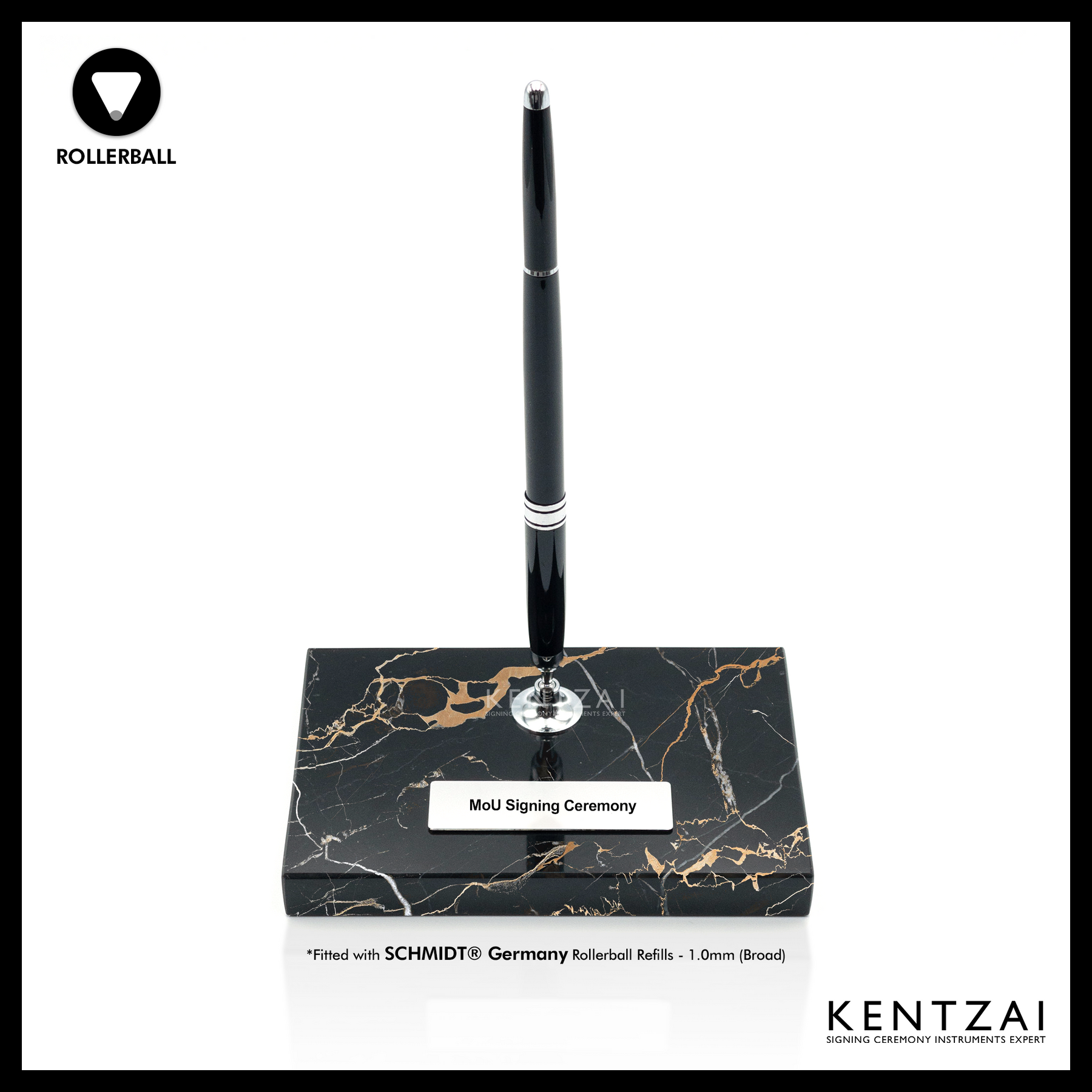 KENTZAI Desk Pen Stand - Black MARBLE Portoro Chrome Trim - (SINGLE Pen) - ROLLERBALL - Signing Ceremony Set