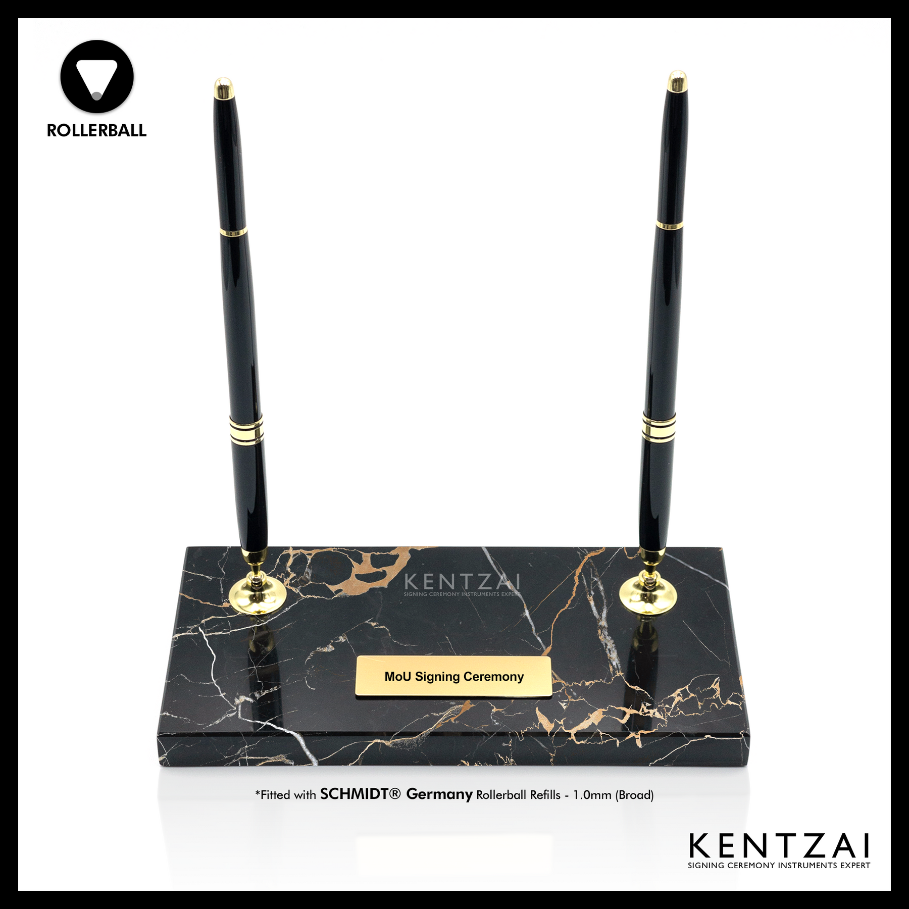 KENTZAI Desk Pen Stand - Black MARBLE Portoro Gold Trim - (DOUBLE Pens) - ROLLERBALL - Signing Ceremony Set