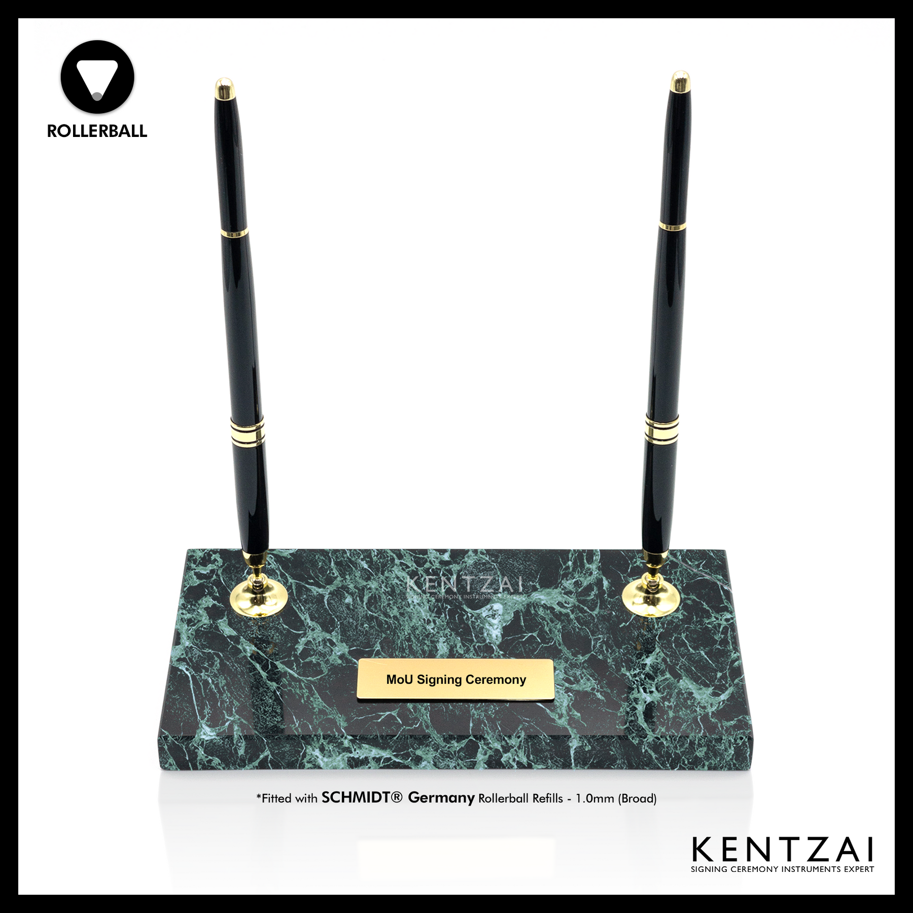 KENTZAI Desk Pen Stand - Black MARBLE Prada Green Gold Trim - (DOUBLE Pens) - ROLLERBALL - Signing Ceremony Set