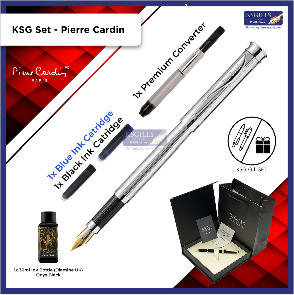 KSG Set - Pierre Cardin Pluto Premium Fountain Pen - Stainless Steel Shinny Chrome Trim (with LASER Engraving)