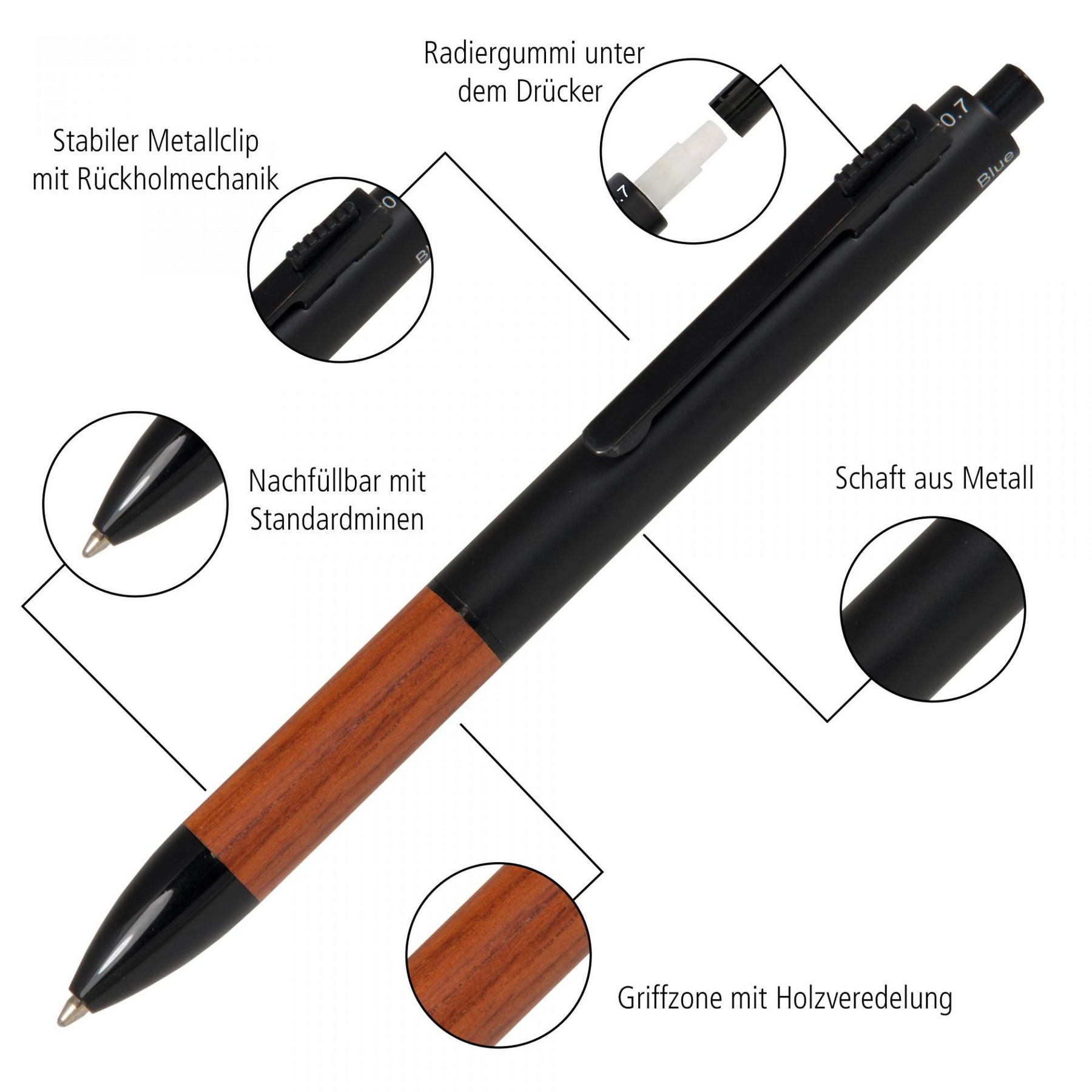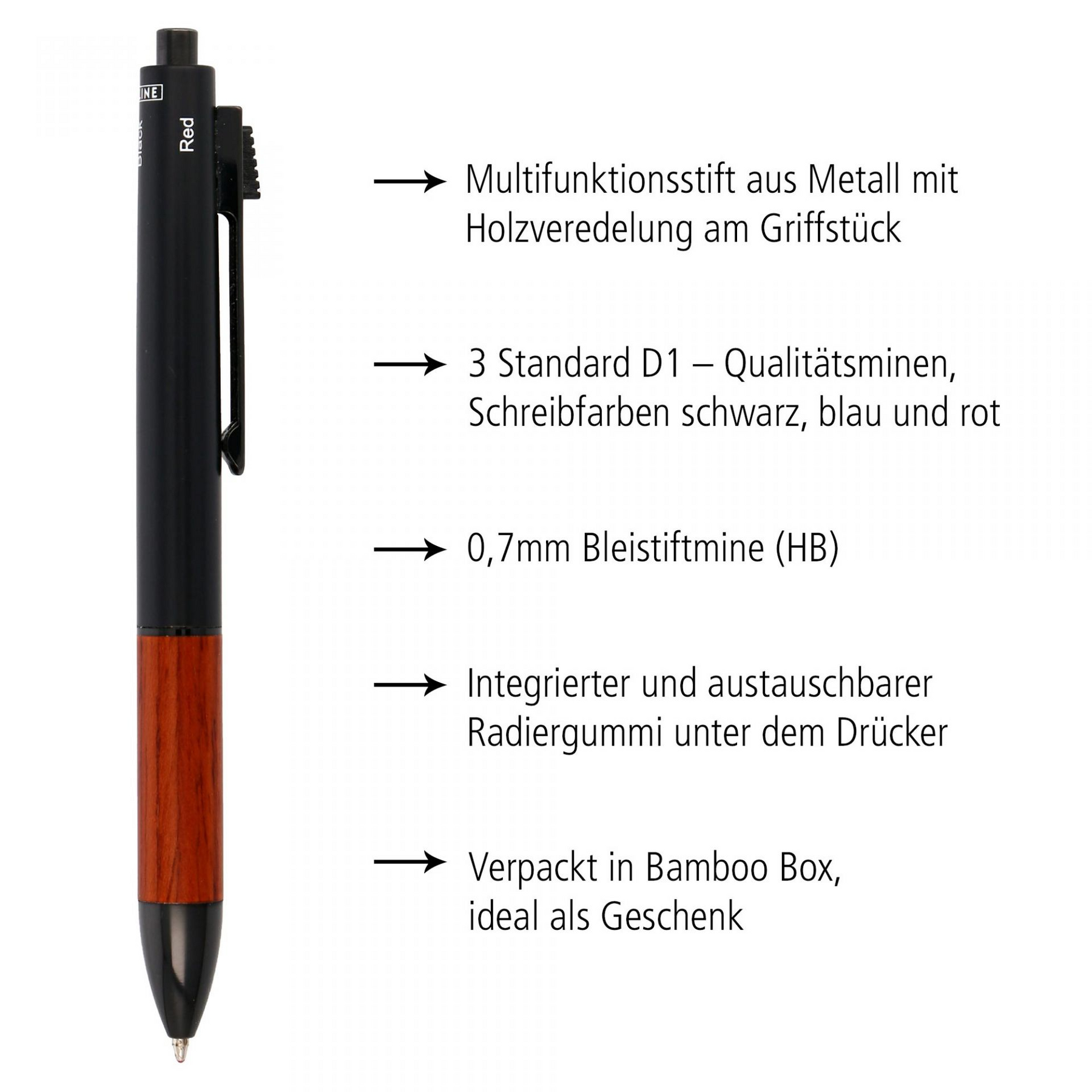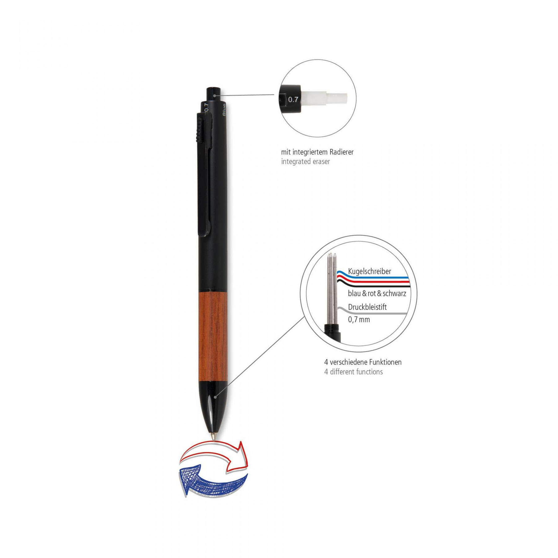 It has even been proven scientifically: if you write by hand you commit more to paper than when using a keyboard and you develop more creative ideas. Designers scribble their initial designs in order to perfect them later on the screen. Or they leave it at the handmade stage and set new trends such as so-called “sketch noting” and “lettering”. Using the new Multifunction Pen with three different types of wood on the body of the pen, colour can also be put on paper in line this trend if required. Featuring three D1 standard refills containing blue, black and red ink, and a 0.7 mm pencil refill (HB). And the eraser is waiting to be used under the press button. A present that is totally on trend in its wonderful Bamboo Pen Box.