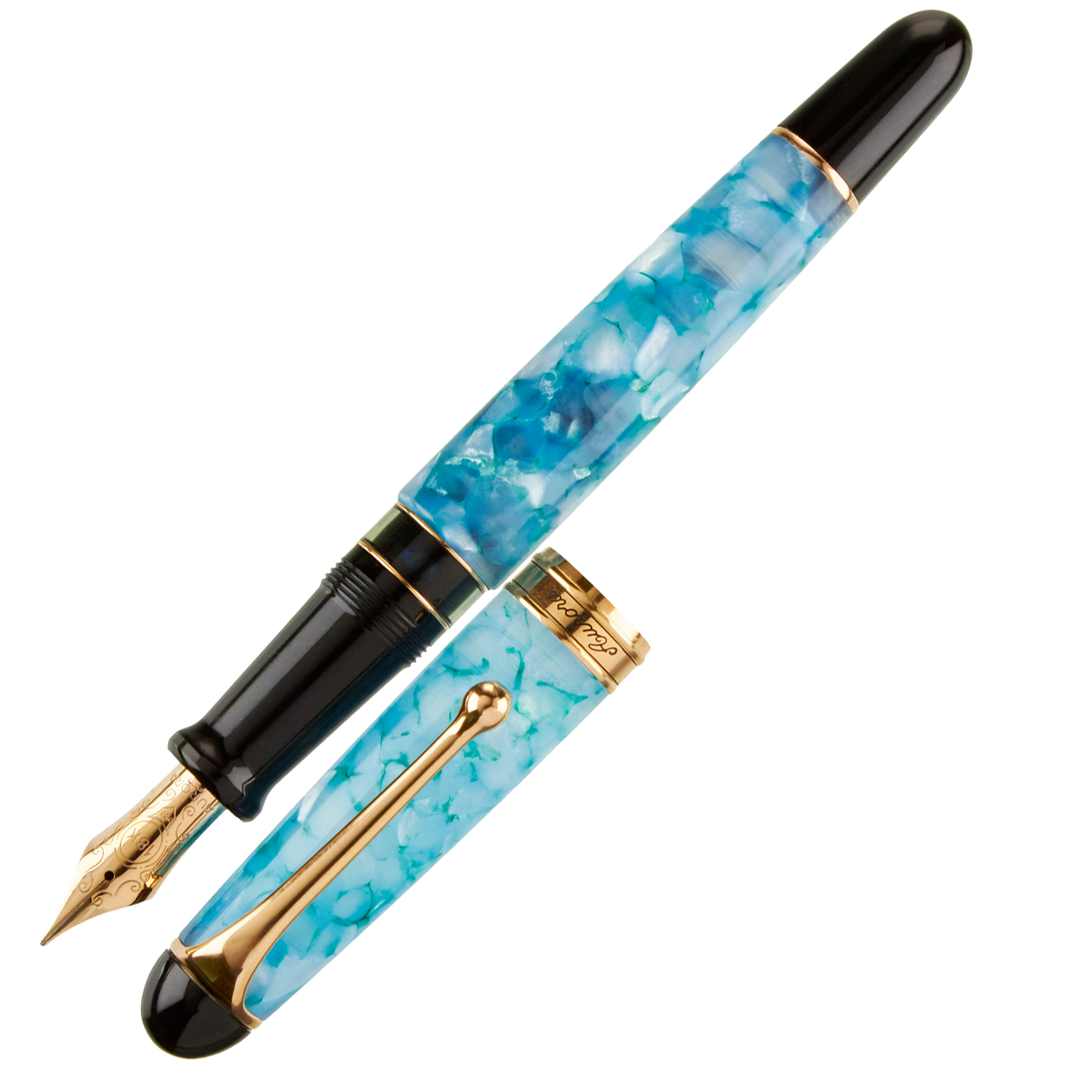 The mixture of helium, hydrogen, and methane in Uranus' atmosphere causes this seventh planet from the sun to absorb the red light from the sun but reflect back the blue, which is why this planet appears as a light azure in most astronomical images. Aurora captures this hue in the cellulose acetate body of this remarkable pen, which is provided with your choice of 18k solid gold nib in rose gold plating.