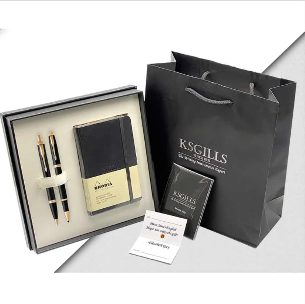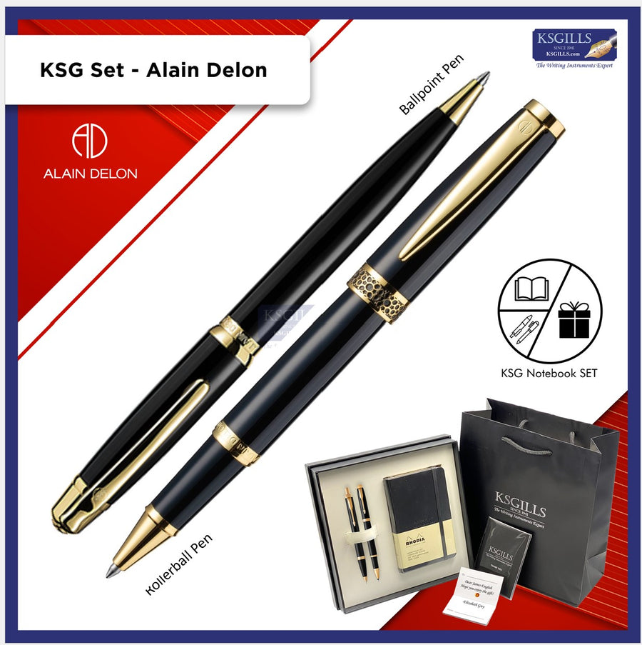 KSG set - Double Pens - Alain Delon Rollerball PREMIUM Size (Florence Black Gold Trim) & Ballpoint Pen (Deco Black Gold Trim) with Luxury Gift Box (BIG) + Notebook
